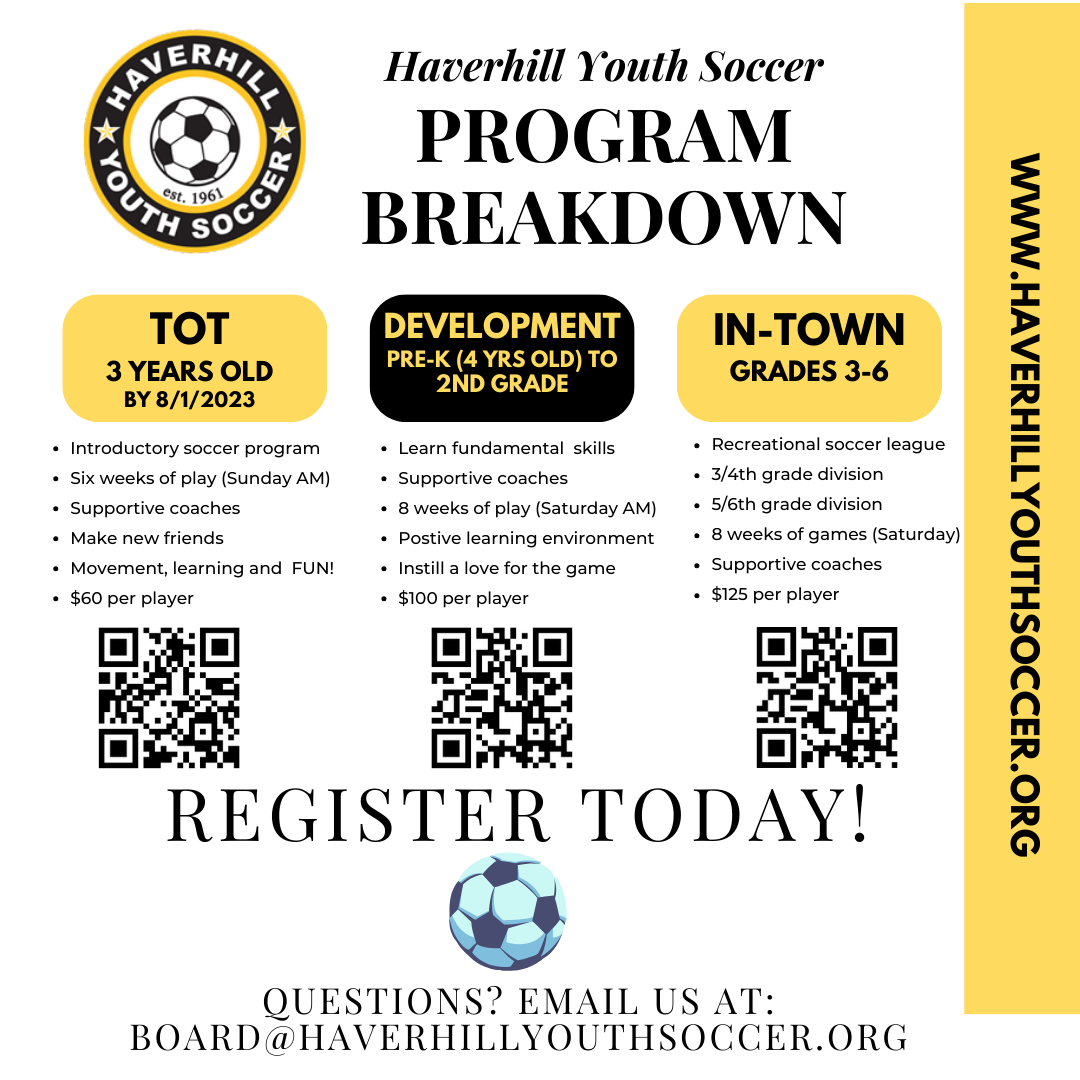 Register today for Tot, Development and In-Town soccer starting this spring.